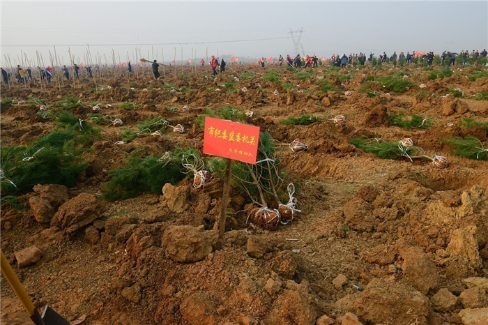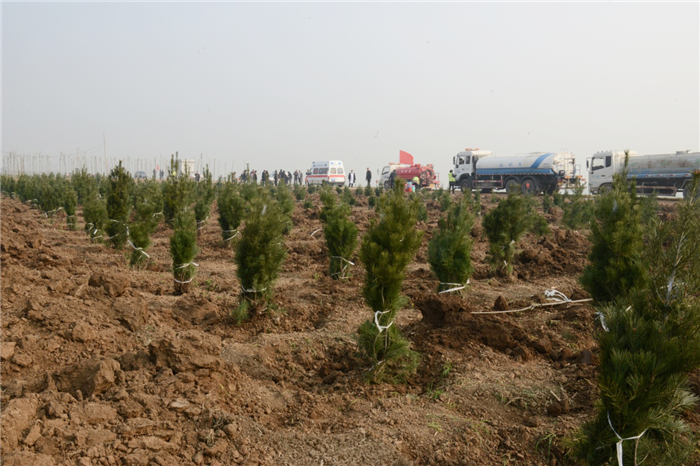 机关干部三人一组,一人扶苗、两人培土,大家配合默契,植树现场一派热火朝天的景象。培好土后,再围着树苗,细心把四周的松土踩实,最后再浇上透水。经过近两个小时努力,共栽树近二百棵。看着自己亲手种下的幼苗,畅想着明天一排排苍翠,大家非常惬意,感到很有成就感。