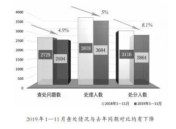 严肃查处力度持续保持,正风肃纪取得实效。截至11月底,全省各级纪检监察机关共查处违反中央八项规定精神问题2594起、处理3684人、给予党纪政务处分2864人,与去年同期相比,分别下降4.9%、5%、8.1%。共分944期,对1962起2806人(次)违反中央八项规定精神典型问题公开通报曝光。(见下图)