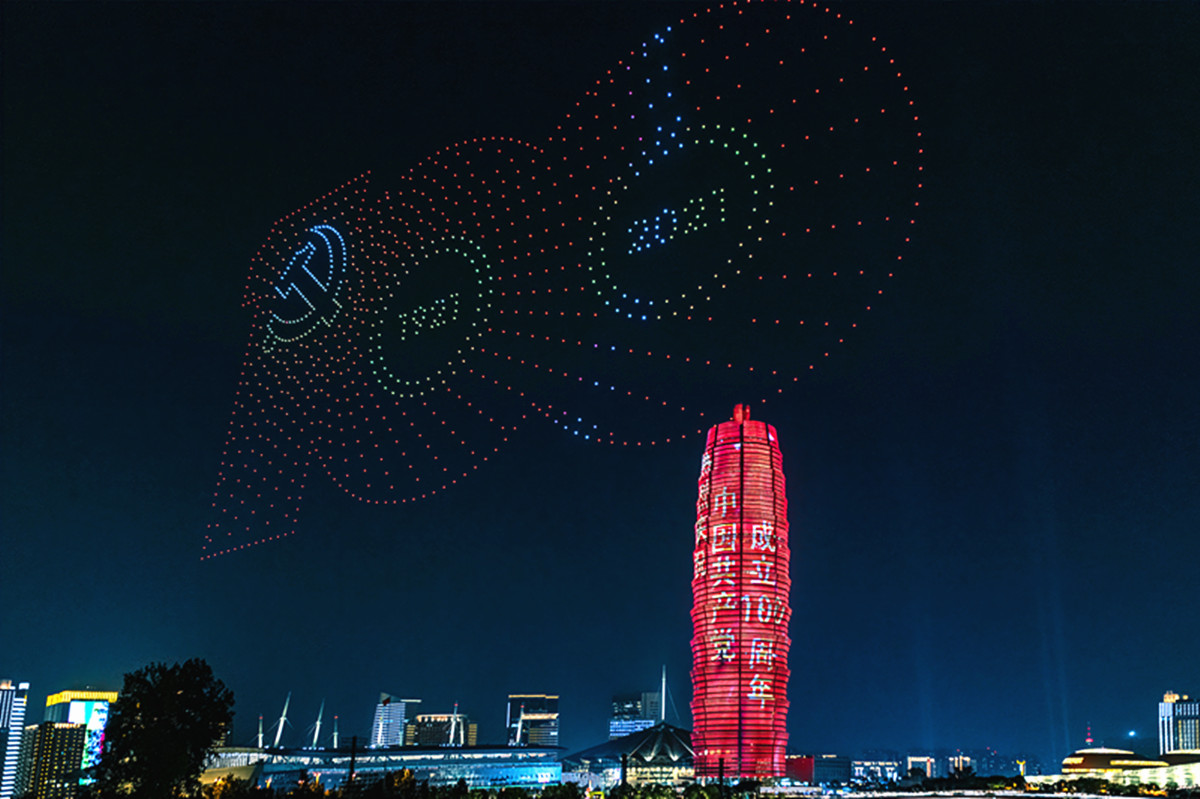 夜幕降临,郑州市郑东新区灯火辉煌,地标性建筑“大玉米”被点亮,该区以灯光为笔墨,以楼群为画布,点亮城市的活力,用灯光秀为党祝福,赞美幸福生活,展示城市发展变化。(新密市纪委监委 朱留波 摄)