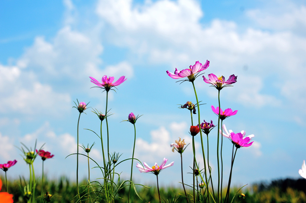 荆棘丛丛也自春,浓香艳色最勾人。夏日的小花五彩缤纷,在蓝天白云下,描绘着一幅多姿多彩的画卷。(商水县纪委监委 郭利军 摄)