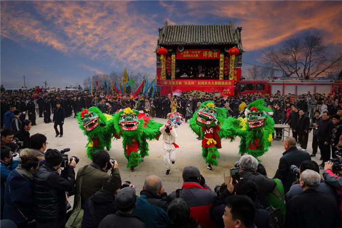 每逢元宵佳节,鹤壁古庙会盛典上都会以舞狮助兴,舞狮表演时而威武勇猛,雄壮威风,时而嬉戏欢乐,幽默诙谐,精彩的表演让游客感受到了舞狮子闹新春的喜庆与热闹。