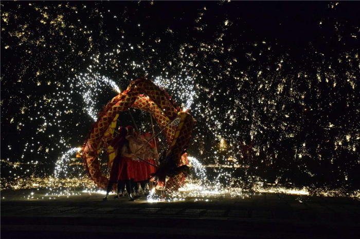 “焰火+舞龙”热热闹闹庆元宵。伴随着激越的鼓点,“火龙”上下翻飞,左挪右腾,街边的铁水匠舀起沸腾的铁水和特制液体抛向夜空,划出一道 “火树银花合,繁光远缀天”的美景。