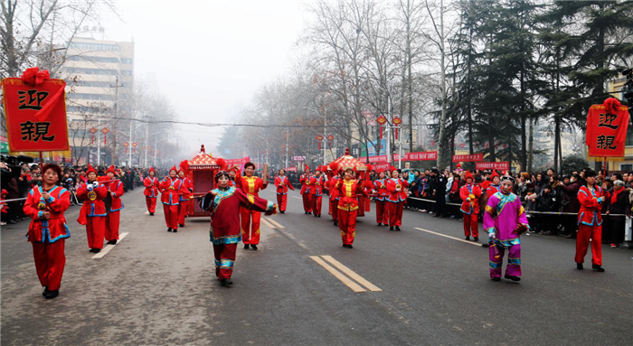 “起轿喽……”元宵佳节,鹤壁市山城区红旗街锣鼓喧天、热闹非凡,传统迎亲队伍缓缓走来,场面十分喜庆,别出心裁的复古迎亲习俗表演引得许多市民驻足观看。