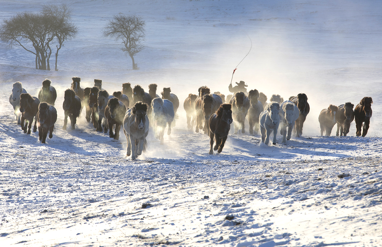 天苍苍,野茫茫,牧马人策马扬鞭,风雪无阻,奔驰在回家的旅途中。