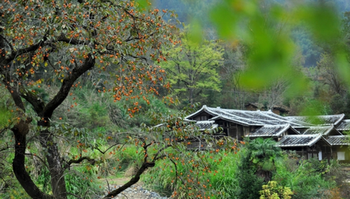 南方山村的屋顶上掩映着一层薄薄的白霜,柿子树上结满的红色果实,伴衬着绿水青山,显得尤为美丽动人。