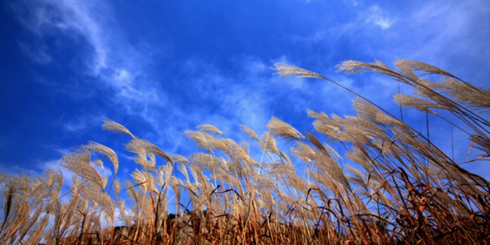簇拥摇曳的芦苇扬花吐絮,婀娜多姿,与湛蓝的天空交相辉映,如脂如染,一派别样景致。