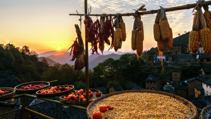 天气晴好,煦煦冬阳穿破山霭照向屋顶房前,照亮了农家淳朴平实的生活,更晒出了物阜年丰的幸福人生。