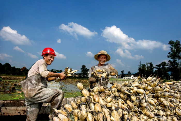 立冬之际正是采藕好时节,刚挖出的莲藕被堆成了一座座小山,农民们汗水跌落藕田,喜悦徜徉心间。