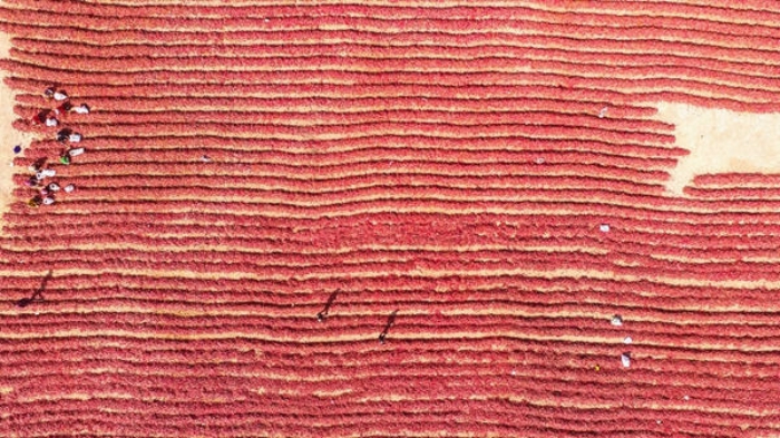 临近立冬,近万亩辣椒丰收晒红戈壁滩,“红红火火”农民喜笑颜开。