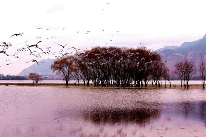 环境优美的河流、湖泊是天鹅、大雁等候鸟迁徙途中理想的休憩地,成群结队的鸟儿迎着寒风,伸展着纤长的双翼在湖面上翩翩起舞,为冬日增一抹生机,添一丝活力。