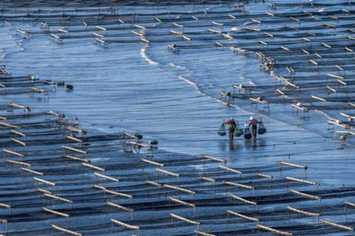 立冬前后是采收紫菜的好时节,海边渔民们随着潮汐出海摘收紫菜,与海风潮汐、日出日落进行一场劳动竞赛。
