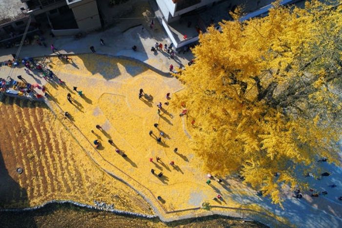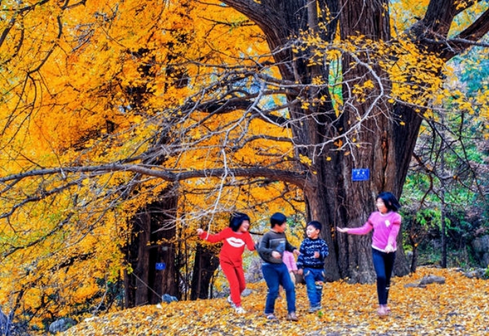 硕大的银杏树被初冬“染”得金黄,落叶铺满大地,无忧无虑的孩童在树下嬉戏玩耍,清脆欢快的笑声在林间荡漾。