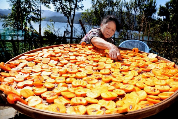 立冬时节,客家人保持着制作柿子蜜饯的习俗,挑选出的上好柿子,经洗净、旋皮、切片、晾晒、喂料后,制成一道招待客人的美味小吃。