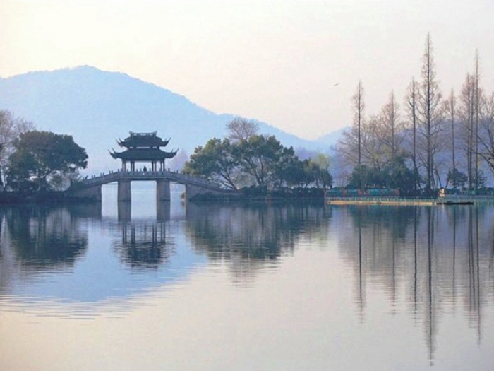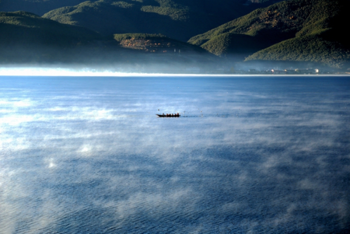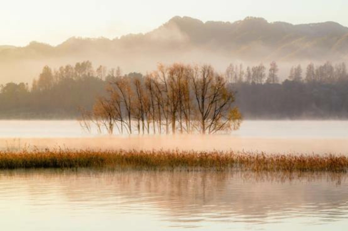 初冬,美丽澄澈的湖面蒙上了一层淡淡的薄雾,像披上一件银色的纱衣,冬阳的光芒射向湖面,微风乍起,细浪跳跃,搅起满湖碎银。