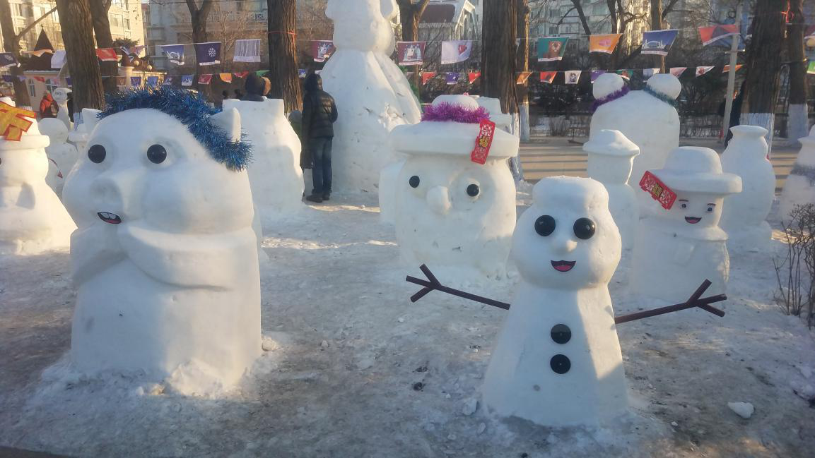 一场大雪过后,街道广场上堆起了形状各异、憨态可掬的雪人,人们出来欣赏雪后的美景,照相留念,给寒冷的腊八节日增添了热闹的景象。