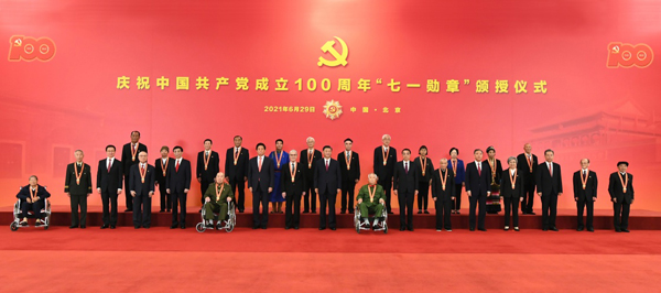 6月29日,庆祝中国共产党成立100周年“七一勋章”颁授仪式在北京人民大会堂金色大厅隆重举行。中共中央总书记、国家主席、中央军委主席习近平向“七一勋章”获得者颁授勋章并发表重要讲话。新华社记者 丁林 摄