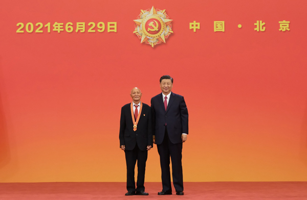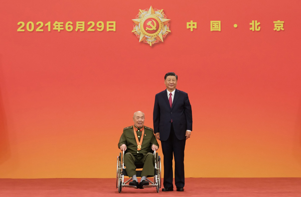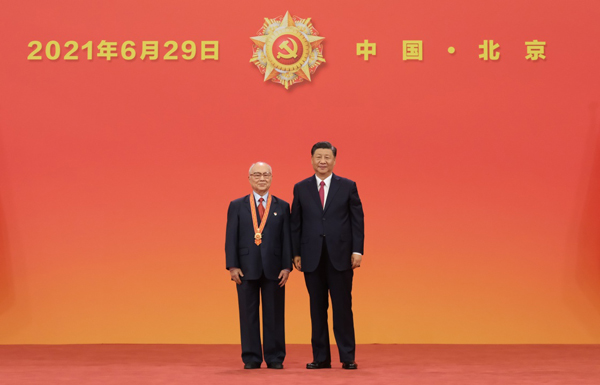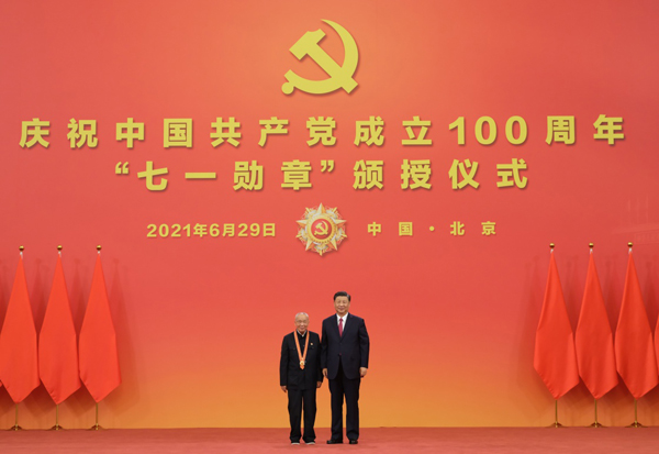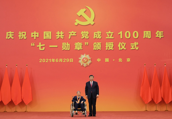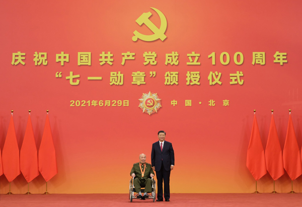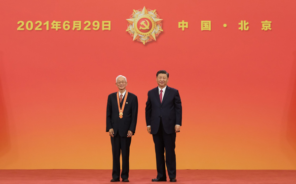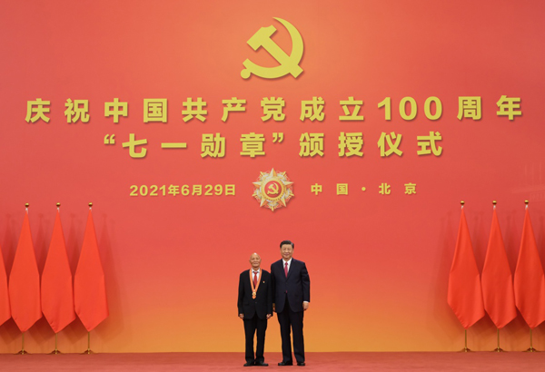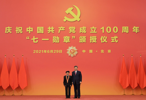 6月29日,庆祝中国共产党成立100周年“七一勋章”颁授仪式在北京人民大会堂金色大厅隆重举行。中共中央总书记、国家主席、中央军委主席习近平向“七一勋章”获得者崔道植颁授勋章。新华社记者 李学仁 摄