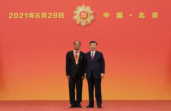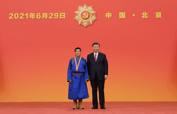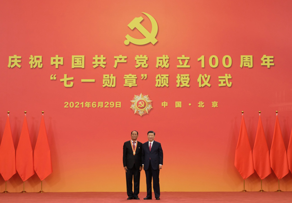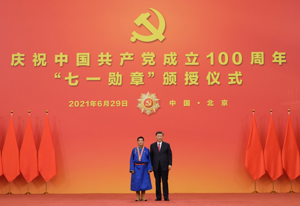 6月29日,庆祝中国共产党成立100周年“七一勋章”颁授仪式在北京人民大会堂金色大厅隆重举行。中共中央总书记、国家主席、中央军委主席习近平向“七一勋章”获得者廷·巴特尔颁授勋章。新华社记者 李学仁 摄