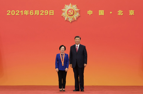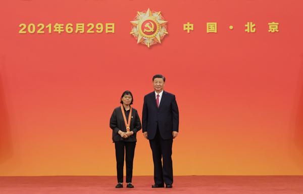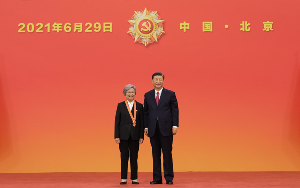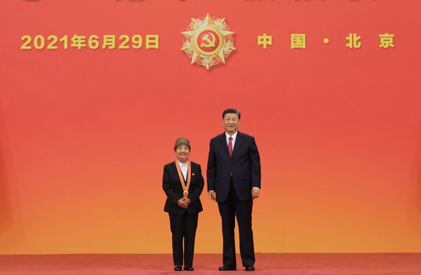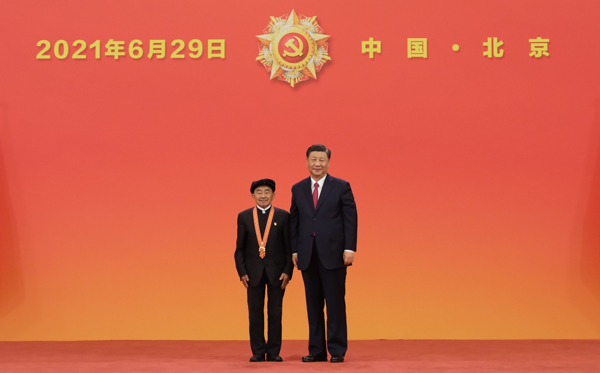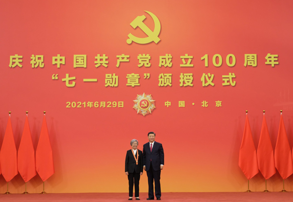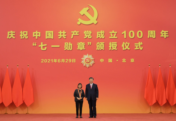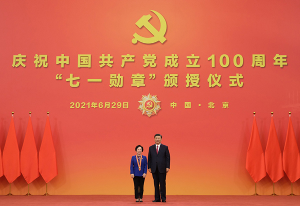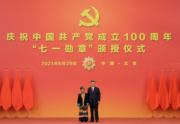 6月29日,庆祝中国共产党成立100周年“七一勋章”颁授仪式在北京人民大会堂金色大厅隆重举行。中共中央总书记、国家主席、中央军委主席习近平向“七一勋章”获得者马毛姐颁授勋章。新华社记者 李学仁 摄