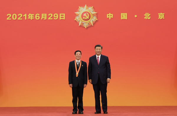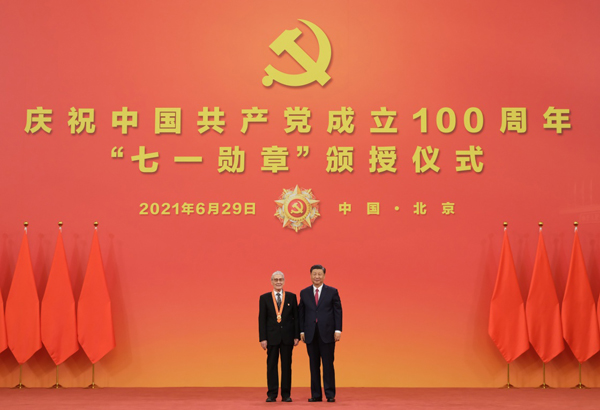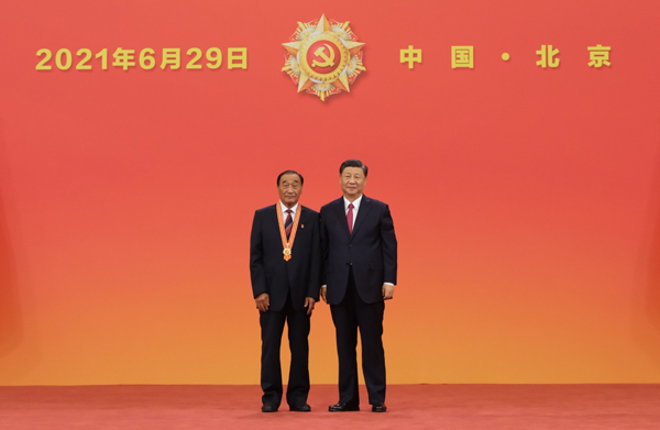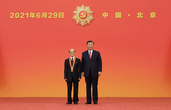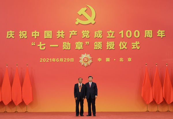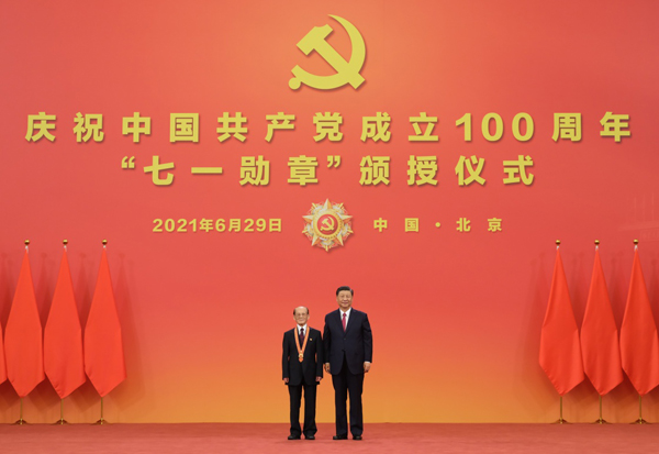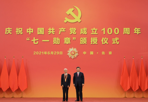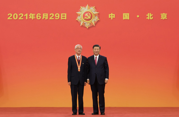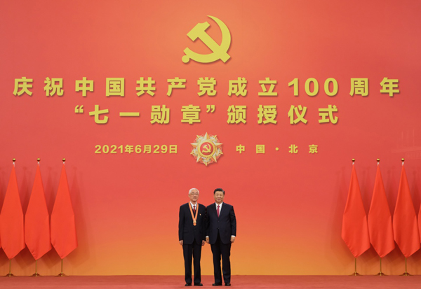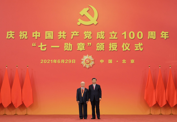 6月29日,庆祝中国共产党成立100周年“七一勋章”颁授仪式在北京人民大会堂金色大厅隆重举行。中共中央总书记、国家主席、中央军委主席习近平向“七一勋章”获得者周永开颁授勋章。新华社记者 李学仁 摄