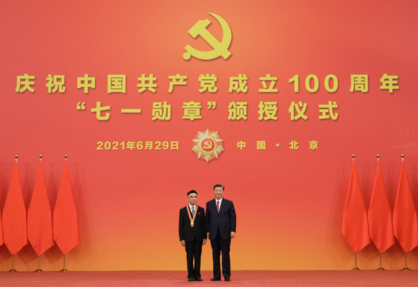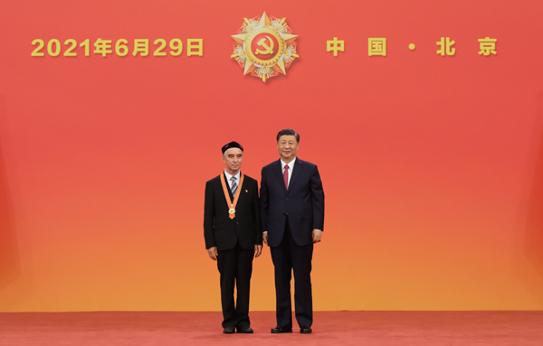 6月29日,庆祝中国共产党成立100周年“七一勋章”颁授仪式在北京人民大会堂金色大厅隆重举行。中共中央总书记、国家主席、中央军委主席习近平向“七一勋章”获得者买买提江·吾买尔颁授勋章。新华社记者 李学仁 摄