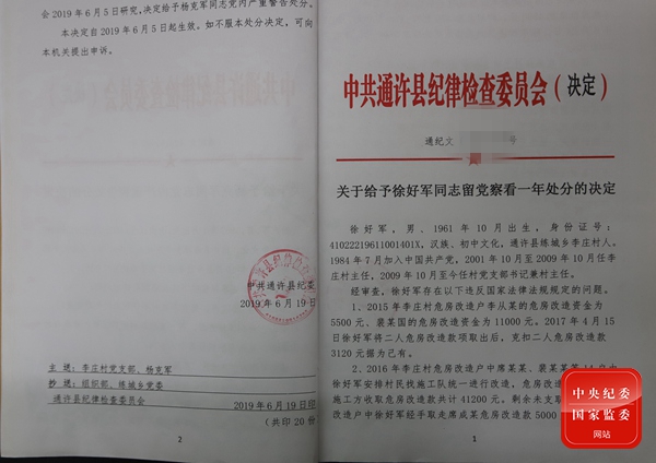 2019年6月,因利用职务便利,侵吞17户危房改造资金累计19920元,徐好军受到留党察看一年处分。