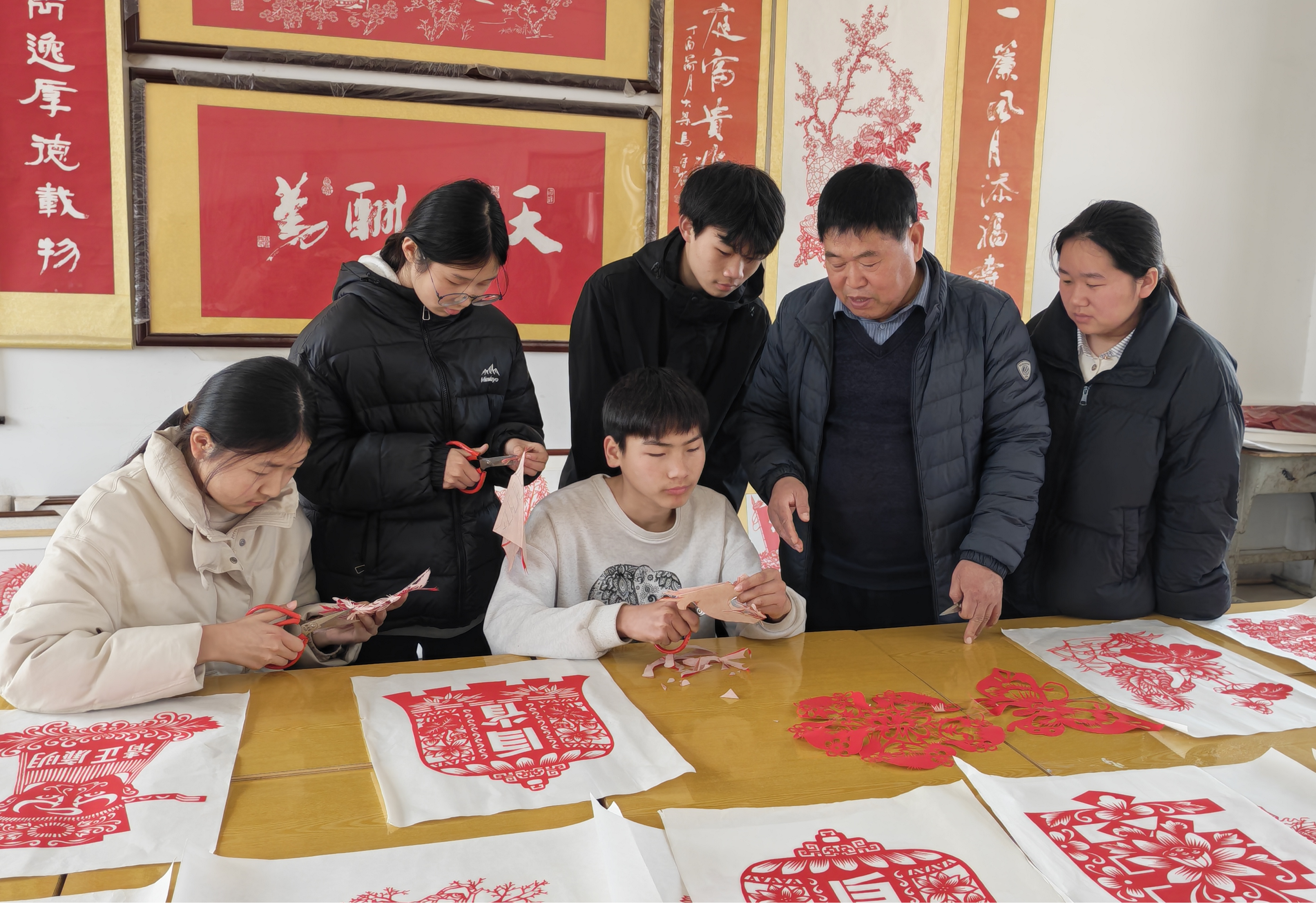 祥符区纪委监委以廉洁文化进校园为切口,深耕青少年廉洁教育沃土,将剪纸等本土非遗与廉洁文化深度融合,通过趣味十足的实践活动,让孩子们在指尖创作中感知廉洁内涵、厚植清廉初心,以童心传廉带动家庭守廉,以校园清风涵养社会正气。图为祥符区范村乡第一初级中学教师高长兴,在社团课上指导学生剪廉洁主题剪纸。(王燕 摄)