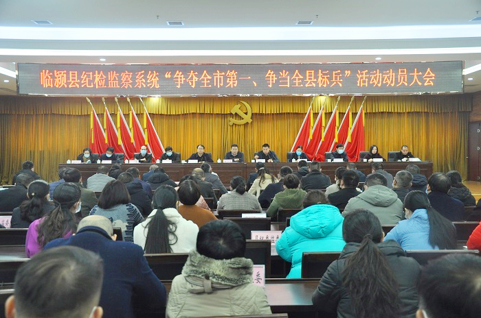 “全县各级纪检监察组织要提升工作标准,提高机关效能,锁定赶超目标,以更大的气魄、更硬的作风、更实的举措,营造解放思想、干事创业、不甘落后、奋勇争先的浓厚氛围......”临颍县纪委书记黄卫平在全县纪检监察系统“争夺全市第一、争当全县标兵”活动动员会上发出了动员令,吹响了冲锋号。