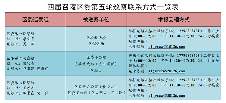 巡察期间,召陵区委各巡察组均开设专门举报电话、电子邮箱和接收短信手机,巡察组根据工作职责,主要受理对上述巡察对象的举报和反映。其他不属于巡察受理范围的信访问题,按有关规定处理。巡察结束后上述举报反映方式将自行关闭。