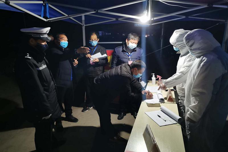 图为参加市疫情防控督查组的市委巡察组有关领导带队夜查交通卡点疫情防控人员在岗值守和防控措施落实等情况