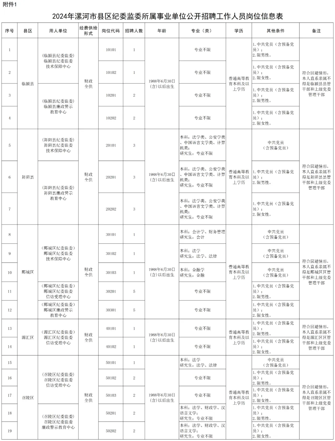 1.2024年漯河市县区纪委监委所属事业单位公开招聘工作人员岗位信息表