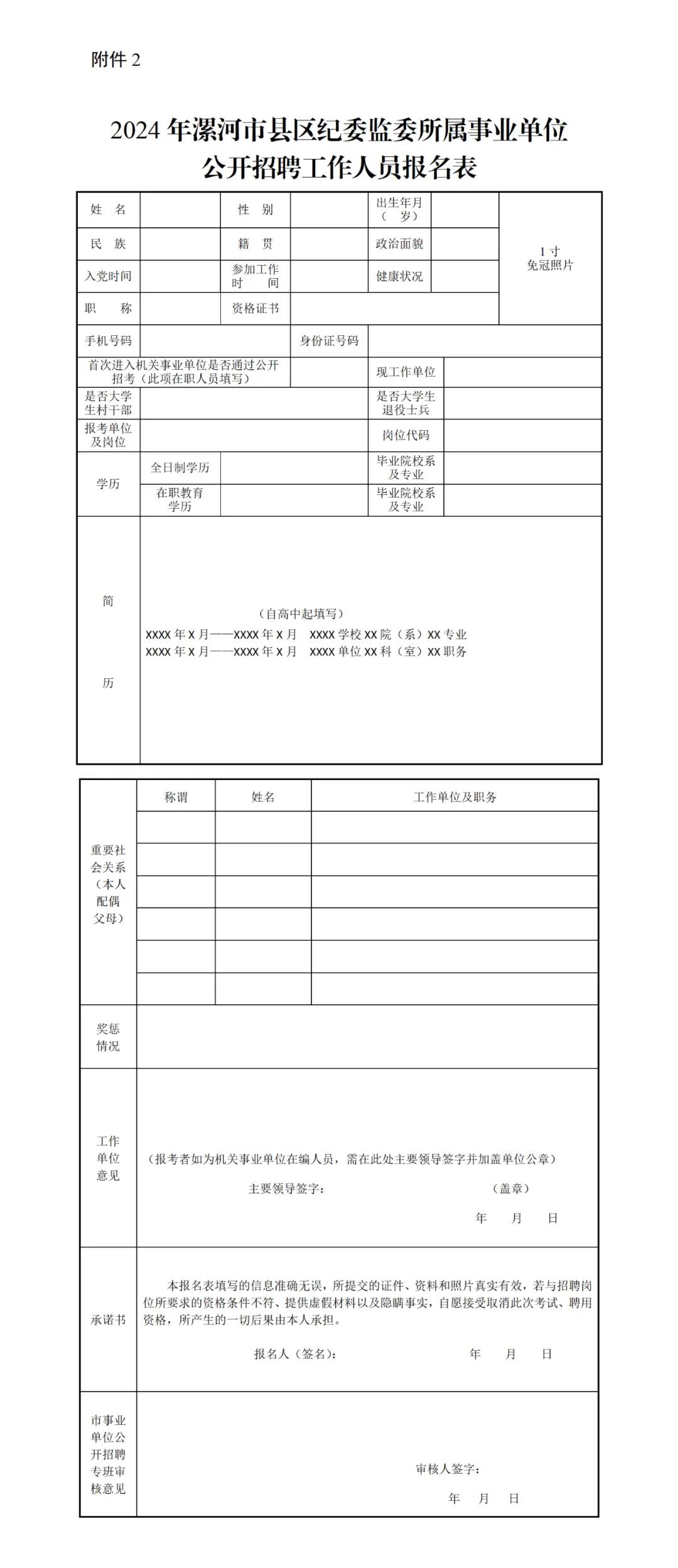 2.2024年漯河市县区纪委监委所属事业单位公开招聘工作人员报名表