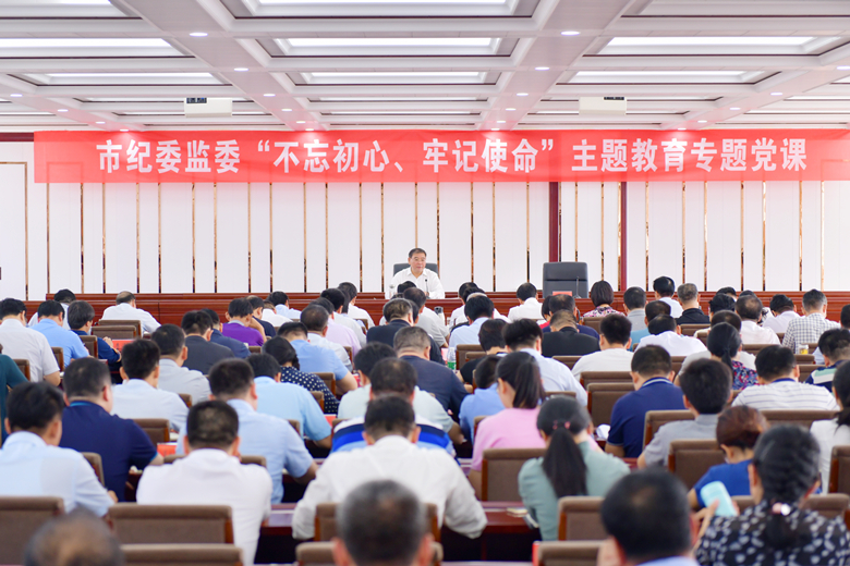 9月30日上午,市纪委监委召开“不忘初心、牢记使命”主题教育专题党课辅导报告会,市委常委、市纪委书记、市监委主任杨骁围绕“以习近平新时代中国特色社会主义思想为指导,站稳人民立场,永葆纪检监察机关政治本色”主题,从关于人民立场,纪检监察干部怎样站稳人民立场,怎样保证纪检监察干部站稳人民立场等三个方面,为全体党员干部做专题党课辅导,并就全市纪检监察干部如何守初心、担使命,提出更高要求,对下一步做好主题教育工作、推动纪检监察工作高质量开展指明方向。