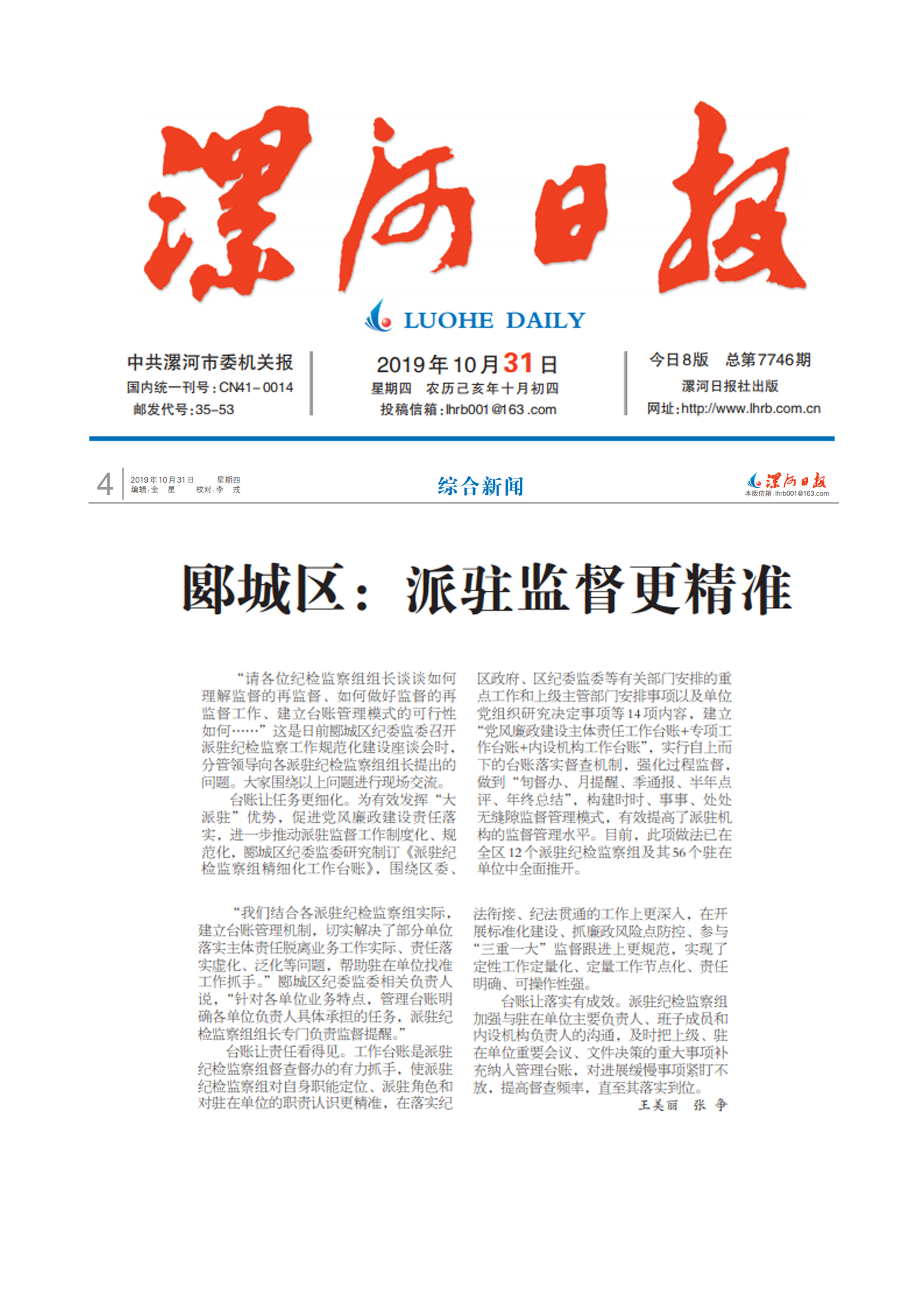 “我们结合各派驻纪检监察组实际,建立台账管理机制,切实解决了部分单位落实主体责任脱离业务工作实际、责任落实虚化、泛化等问题,帮助驻在单位找准工作抓手。”郾城区纪委监委相关负责人说,“针对各单位业务特点,管理台账明确各单位负责人具体承担的任务,派驻纪检监察组组长专门负责监督提醒。”