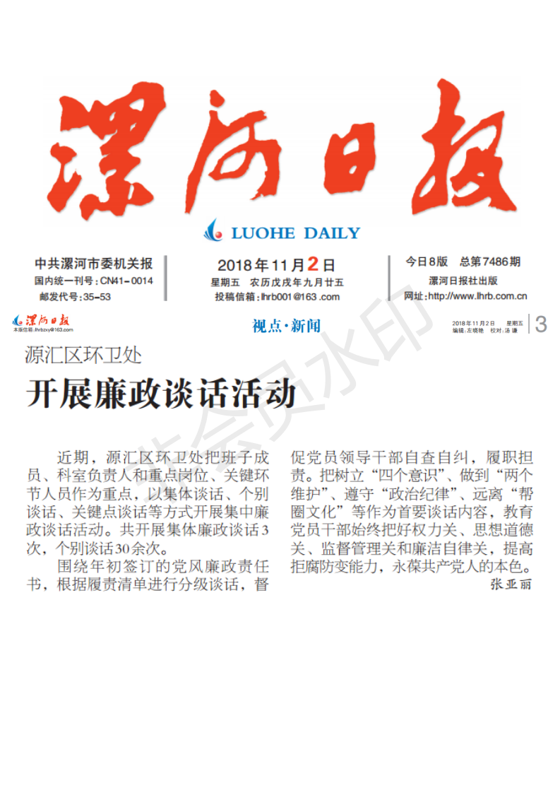 近期,源汇区环卫处把班子成员、科室负责人和重点岗位、关键环节人员作为重点,以集体谈话、个别谈话、关键点谈话等方式开展集中廉政谈话活动。共开展集体廉政谈话3次,个别谈话30余次。