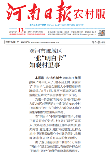 (记者仵树大通讯员王美丽张伟)“俺年纪大了,也不会上网,现在有了‘明白卡’,居委会里的大小事都看得清清楚楚。”8月1日,漯河市郾城区城关镇孟南社区卢大爷手里拿着“明白卡”说。