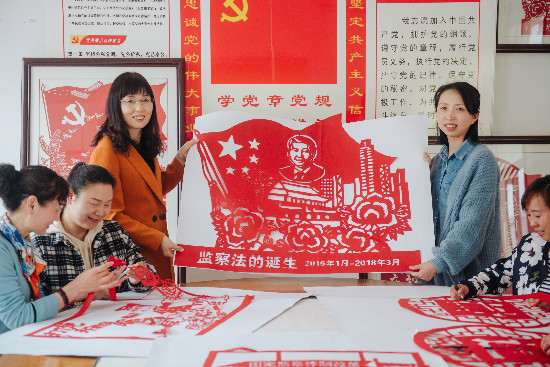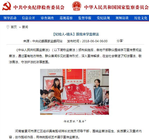 河南省漯河市源汇区组织具有剪纸特长的党员领导干部,围绕监察法诞生、实质要义及重点内容,创作剪纸作品,用传统剪纸艺术展示宣传监察法。
