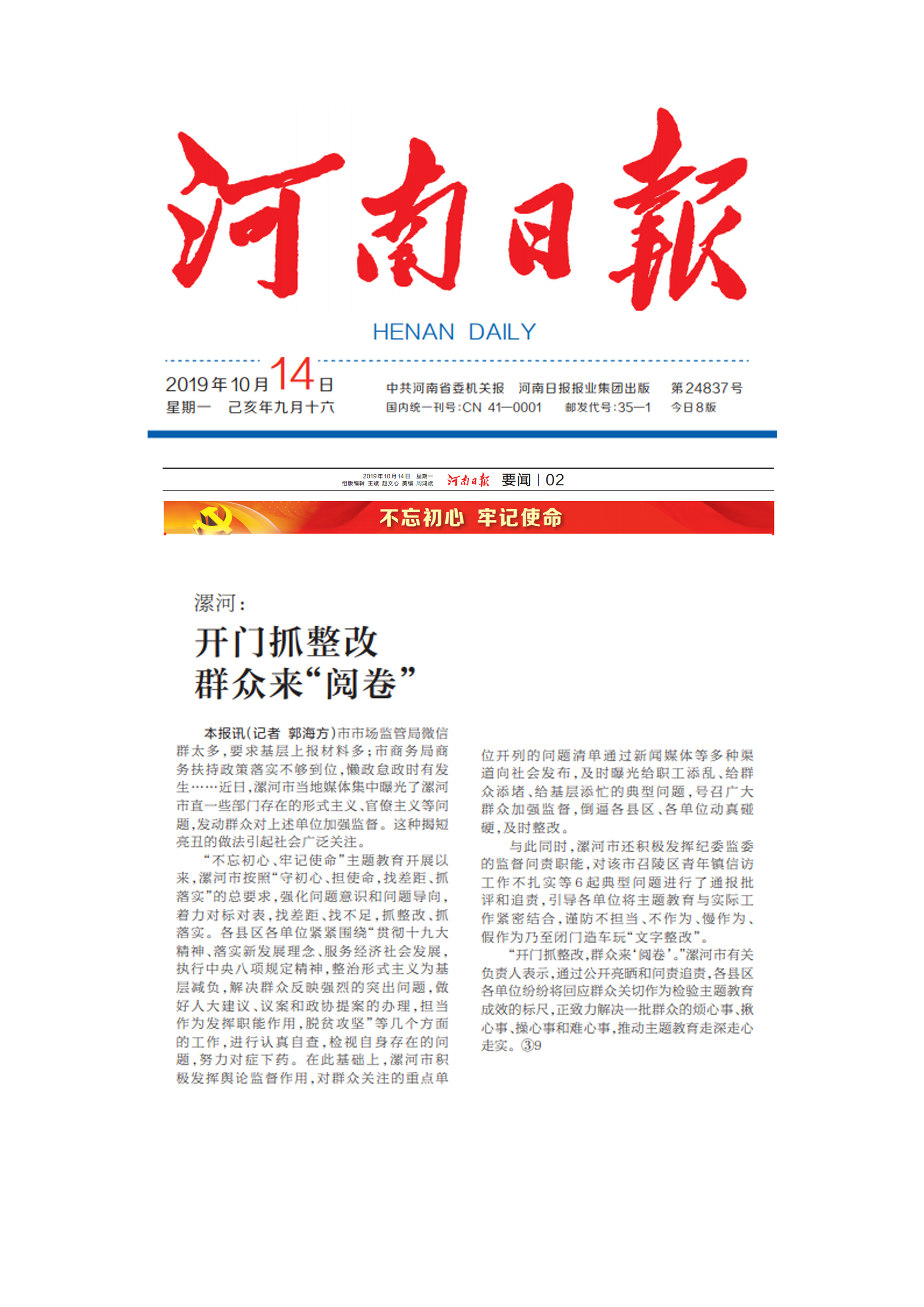 “不忘初心、牢记使命”主题教育开展以来,漯河市按照“守初心、担使命,找差距、抓落实”的总要求,强化问题意识和问题导向,着力对标对表,找差距、找不足,抓整改、抓落实。各县区各单位紧紧围绕“贯彻十九大精神、落实新发展理念、服务经济社会发展,执行中央八项规定精神,整治形式主义为基层减负,解决群众反映强烈的突出问题,做好人大建议、议案和政协提案的办理,担当作为发挥职能作用,脱贫攻坚”等几个方面的工作,进行认真自查,检视自身存在的问题,努力对症下药。在此基础上,漯河市积极发挥舆论监督作用,对群众关注的重点单位开列的问题清单通过新闻媒体等多种渠道向社会发布,及时曝光给职工添乱、给群众添堵、给基层添忙的典型问题,号召广大群众加强监督,倒逼各县区、各单位动真碰硬,及时整改。