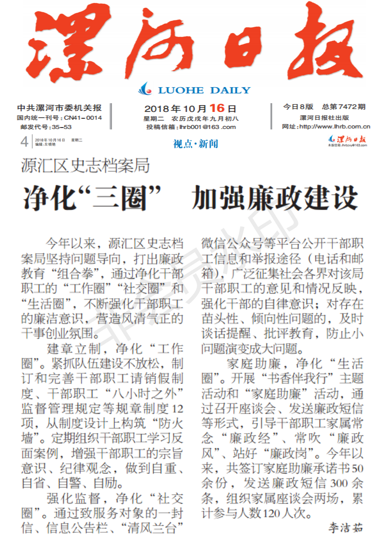 今年以来,源汇区史志档案局坚持问题导向,打出廉政教育“组合拳”,通过净化干部职工的“工作圈”“社交圈”和“生活圈”,不断强化干部职工的廉洁意识,营造风清气正的干事创业氛围。