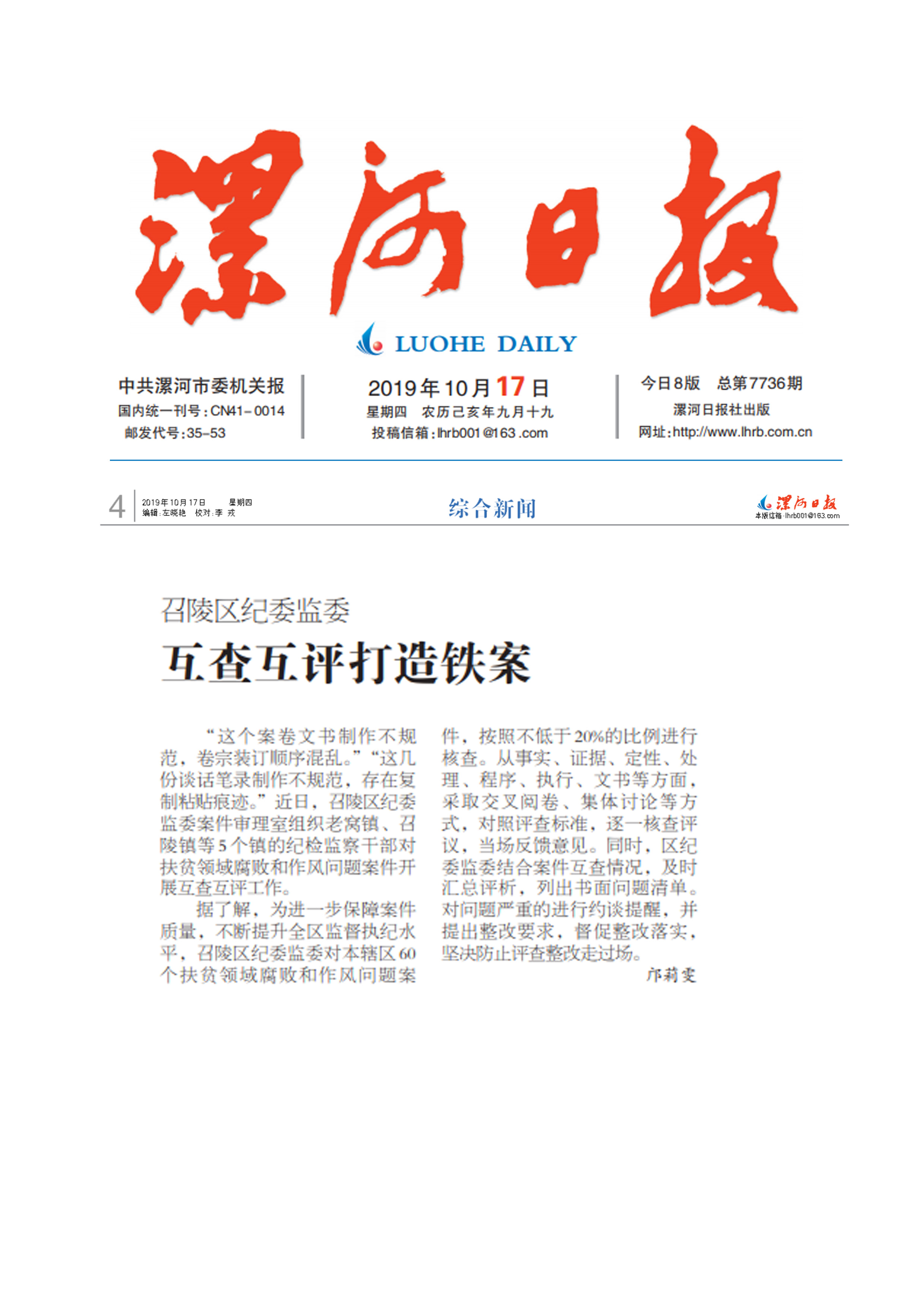 据了解,为进一步保障案件质量,不断提升全区监督执纪水平,召陵区纪委监委对本辖区60个扶贫领域腐败和作风问题案件,按照不低于20%的比例进行核查。从事实、证据、定性、处理、程序、执行、文书等方面,采取交叉阅卷、集体讨论等方式,对照评查标准,逐一核查评议,当场反馈意见。同时,区纪委监委结合案件互查情况,及时汇总评析,列出书面问题清单。对问题严重的进行约谈提醒,并提出整改要求,督促整改落实,坚决防止评查整改走过场。