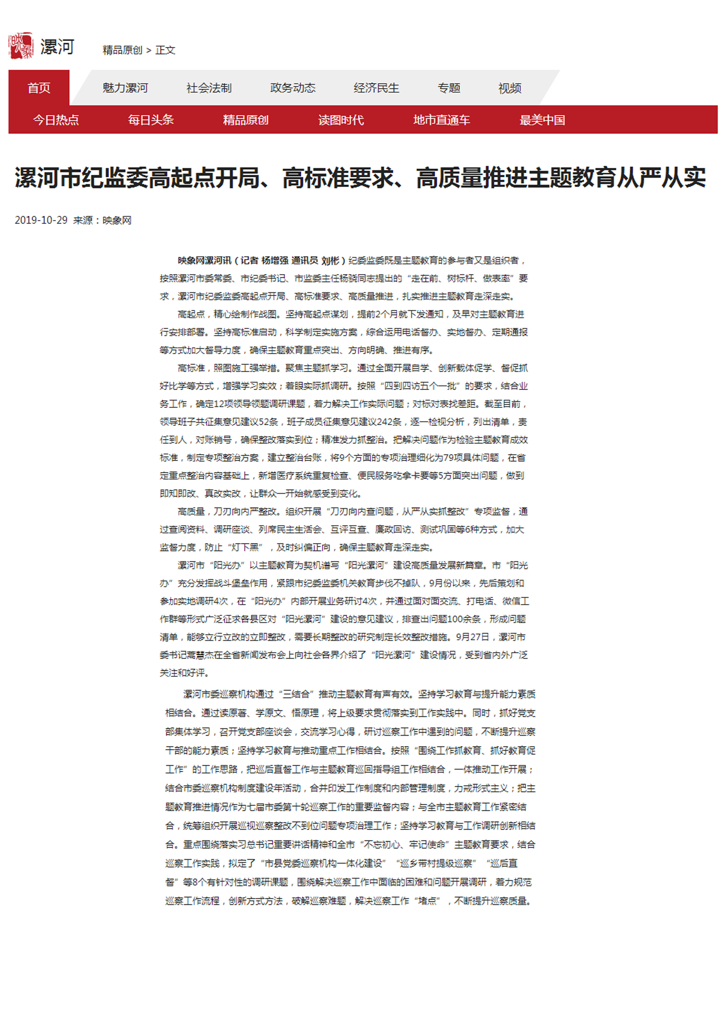 映象网漯河讯(记者 杨增强 通讯员 刘彬)纪委监委既是主题教育的参与者又是组织者,按照漯河市委常委、市纪委书记、市监委主任杨骁同志提出的“走在前、树标杆、做表率”要求,漯河市纪委监委高起点开局、高标准要求、高质量推进,扎实推进主题教育走深走实。