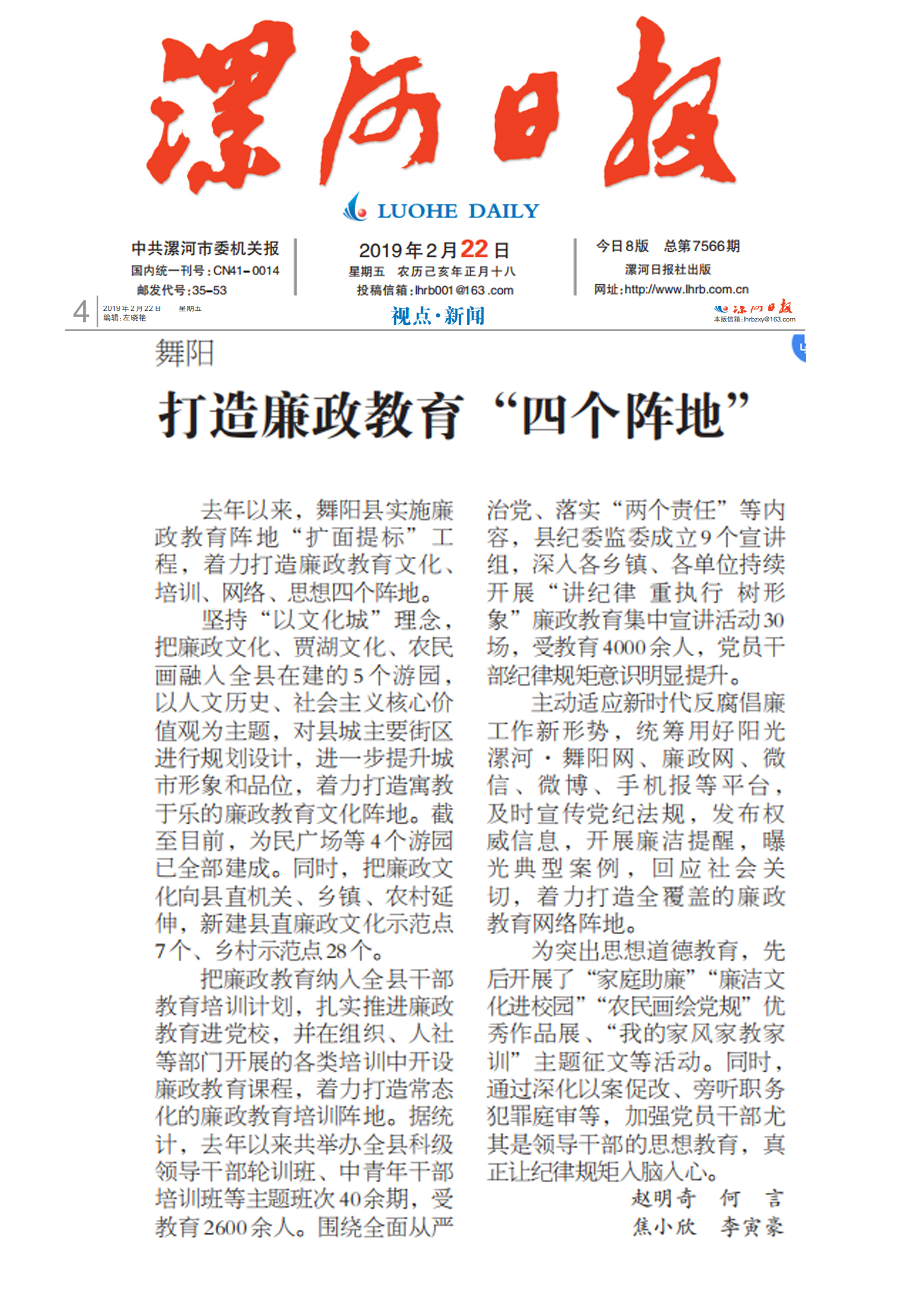 主动适应新时代反腐倡廉工作新形势,统筹用好阳光漯河·舞阳网、廉政网、微信、微博、手机报等平台,及时宣传党纪法规,发布权威信息,开展廉洁提醒,曝光典型案例,回应社会关切,着力打造全覆盖的廉政教育网络阵地。