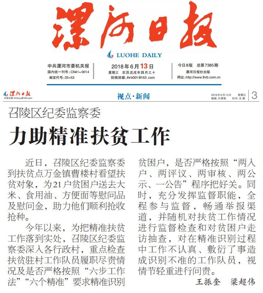 今年以来,为把精准扶贫工作落到实处,召陵区纪委监察委深入各行政村,重点检查扶贫驻村工作队员履职尽责情况及是否严格按照“六步工作法”“六个精准”要求精准识别贫困户,是否严格按照“两入户、两评议、两审核、两公示、一公告”程序把好关。同时,充分发挥监督职能,全程参与监督,畅通举报渠道,并随机对扶贫工作情况进行监督检查和对贫困户走访抽查,对在精准识别过程中工作不认真、敷衍了事造成识别不准的工作队员,视情节轻重进行问责。(王振奎 梁超伟)