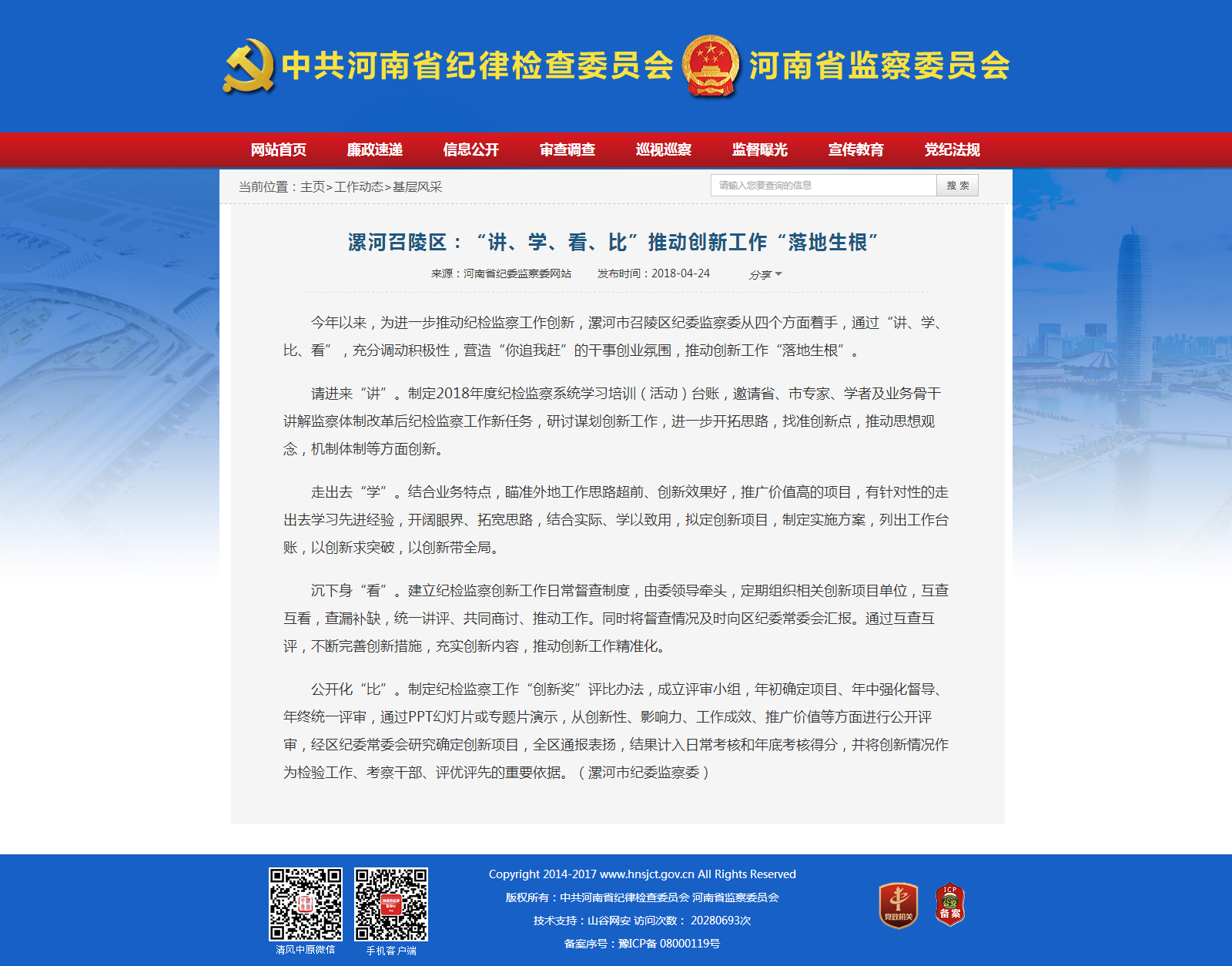 公开化“比”。制定纪检监察工作“创新奖”评比办法,成立评审小组,年初确定项目、年中强化督导、年终统一评审,通过PPT幻灯片或专题片演示,从创新性、影响力、工作成效、推广价值等方面进行公开评审,经区纪委常委会研究确定创新项目,全区通报表扬,结果计入日常考核和年底考核得分,并将创新情况作为检验工作、考察干部、评优评先的重要依据。(漯河市纪委监察委)