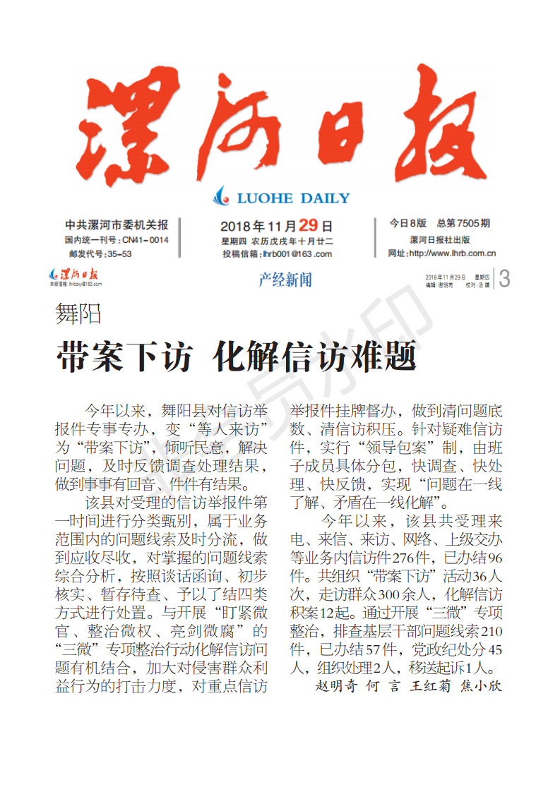 今年以来,舞阳县对信访举报件专事专办,变“等人来访”为“带案下访”,倾听民意,解决问题,及时反馈调查处理结果,做到事事有回音、件件有结果。