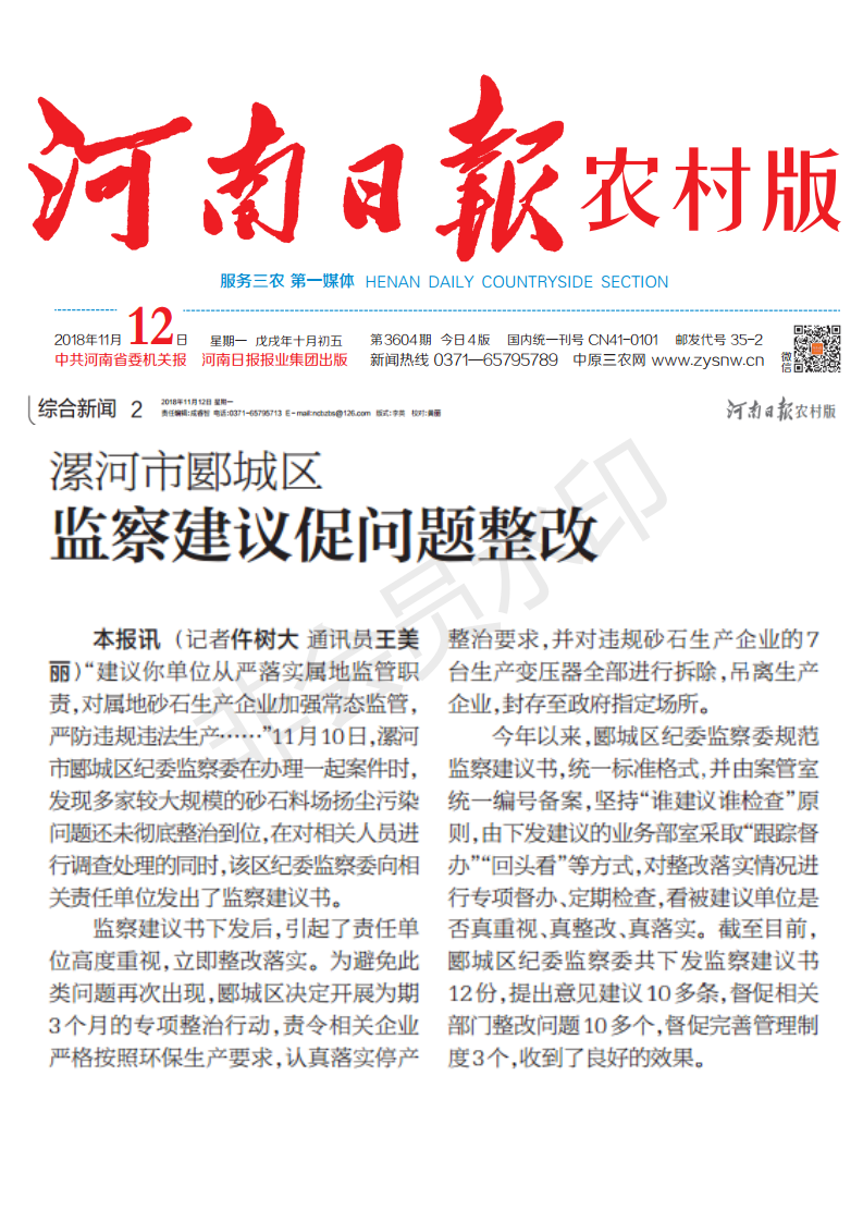 (记者仵树大通讯员王美丽)“建议你单位从严落实属地监管职责,对属地砂石生产企业加强常态监管,严防违规违法生产……”11月10日,漯河市郾城区纪委监察委在办理一起案件时,发现多家较大规模的砂石料场扬尘污染问题还未彻底整治到位,在对相关人员进行调查处理的同时,该区纪委监察委向相关责任单位发出了监察建议书。