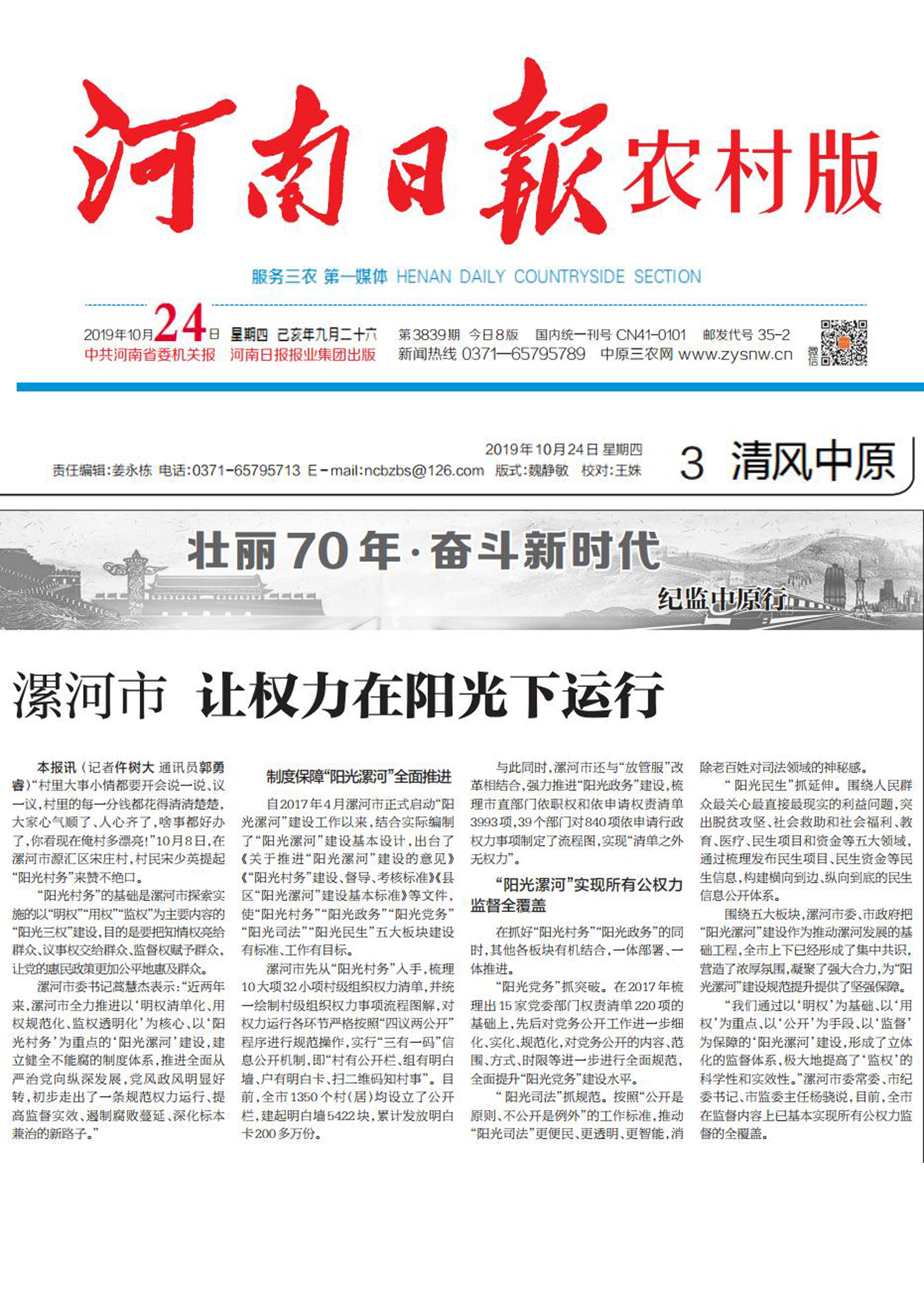 与此同时,漯河市还与“放管服”改革相结合,强力推进“阳光政务”建设,梳理市直部门依职权和依申请权责清单3993项,39个部门对840项依申请行政权力事项制定了流程图,实现“清单之外无权力”。