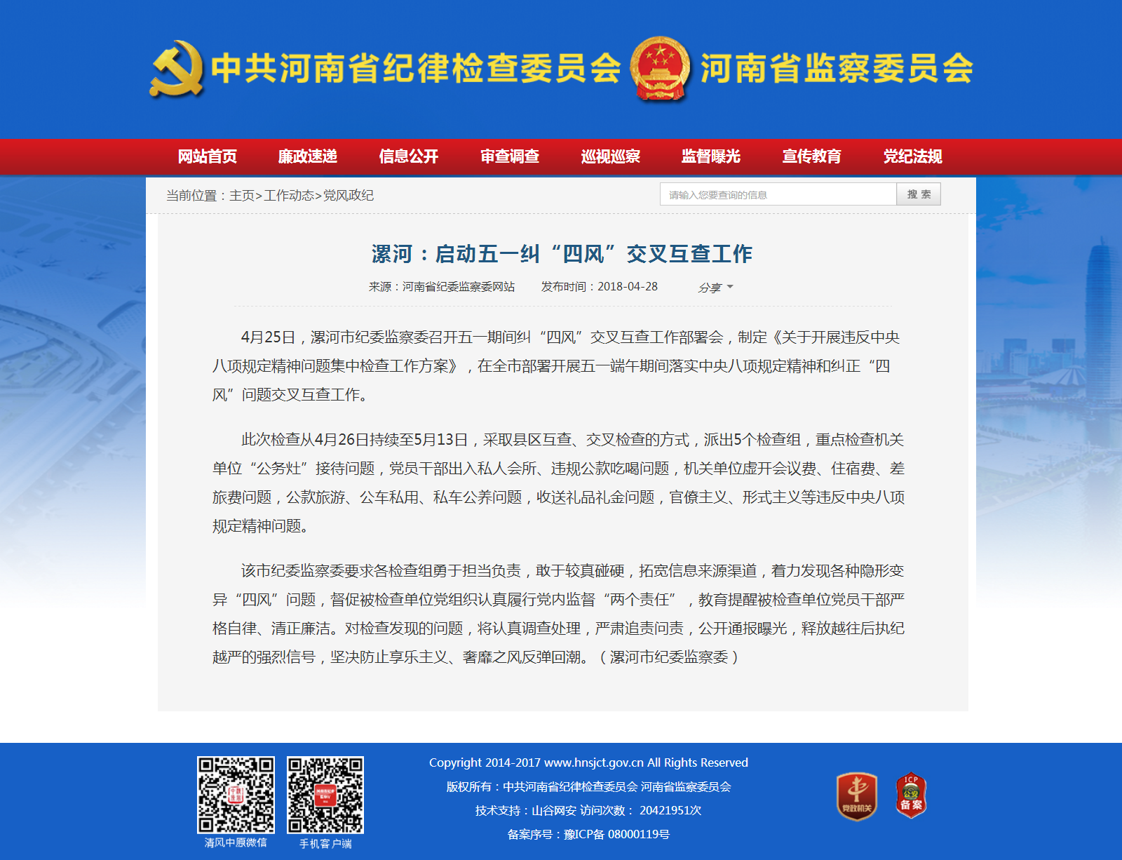 4月25日,漯河市纪委监察委召开五一期间纠“四风”交叉互查工作部署会,制定《关于开展违反中央八项规定精神问题集中检查工作方案》,在全市部署开展五一端午期间落实中央八项规定精神和纠正“四风”问题交叉互查工作。