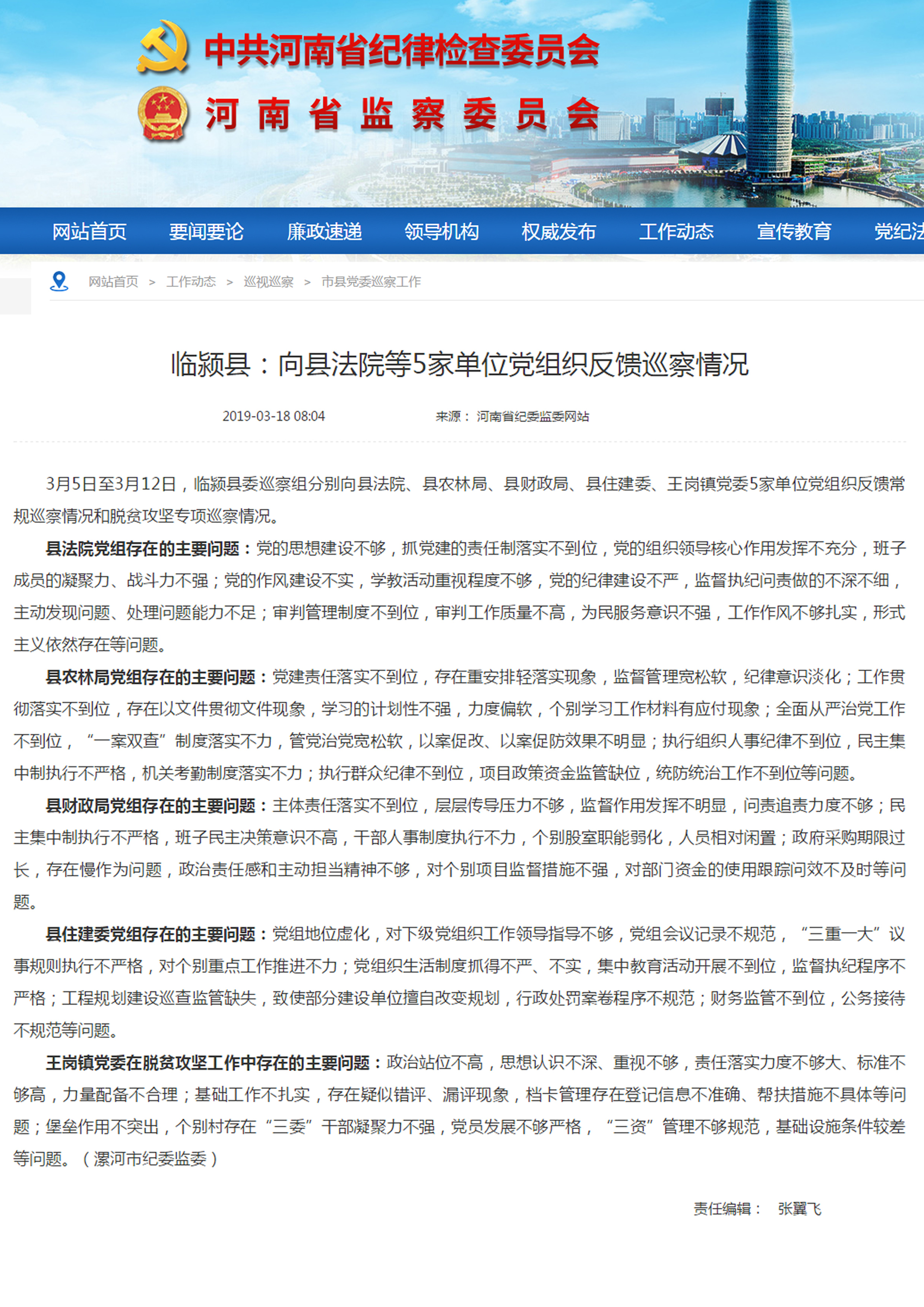 3月5日至3月12日,临颍县委巡察组分别向县法院、县农林局、县财政局、县住建委、王岗镇党委5家单位党组织反馈常规巡察情况和脱贫攻坚专项巡察情况。