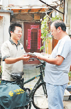 付永伟骑自行车穿梭在大街小巷,及时准确地把报纸和信件等送到用户手中。资料照片